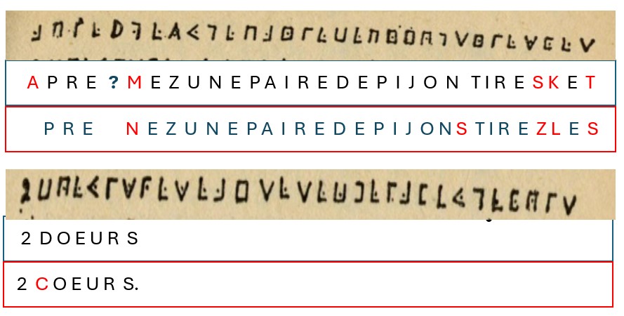 - Le bleu correspond à du vieux français. Il faut effectivement le prendre en compte dans la traduction du cryptogramme.